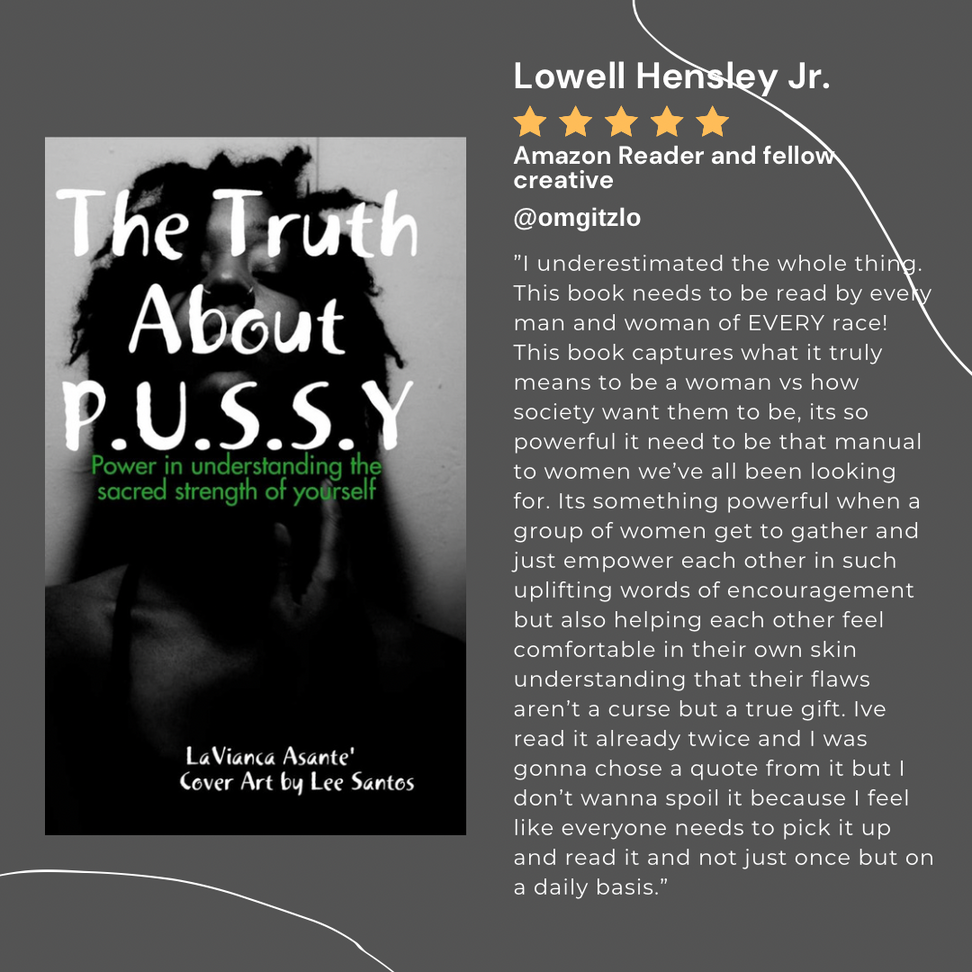 The Truth About PUSSY is a declaration, reclamation and proclamation celebrating the sexuality, tenderness, sacrifice and strength of womanhood re-instating the importance of self-love through the collection of poetry. Inspired by both dear friend Priscilla Azaglo's performance of the poem "Pussy" featured in her book "For Girls Who Cry In Yellow" and the lives of women who made the most impact on the author's life.
